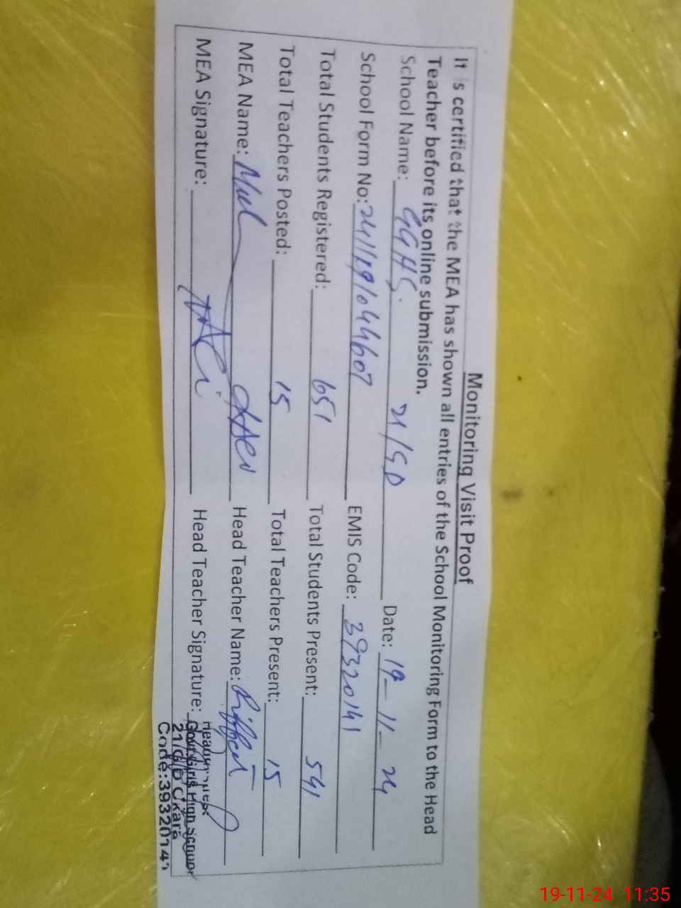 | Certified that this School was Inspected by the Undersigned MEA/DMO Today and the Information Stated Above is as Per Record. | |||||