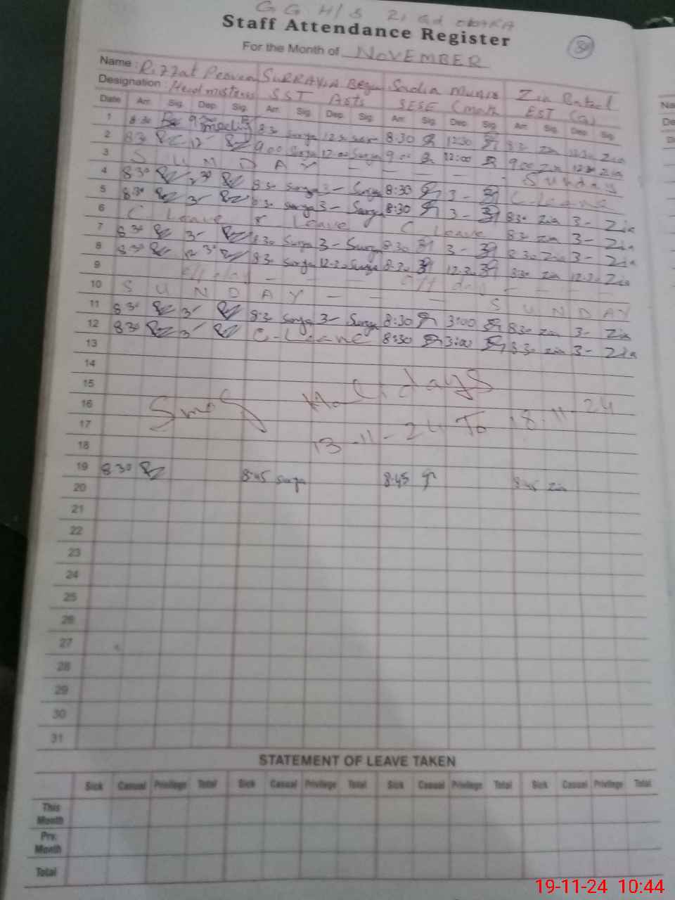 | CNIC | Full Name | Designation | R/C | Absence During Last Calender Month |