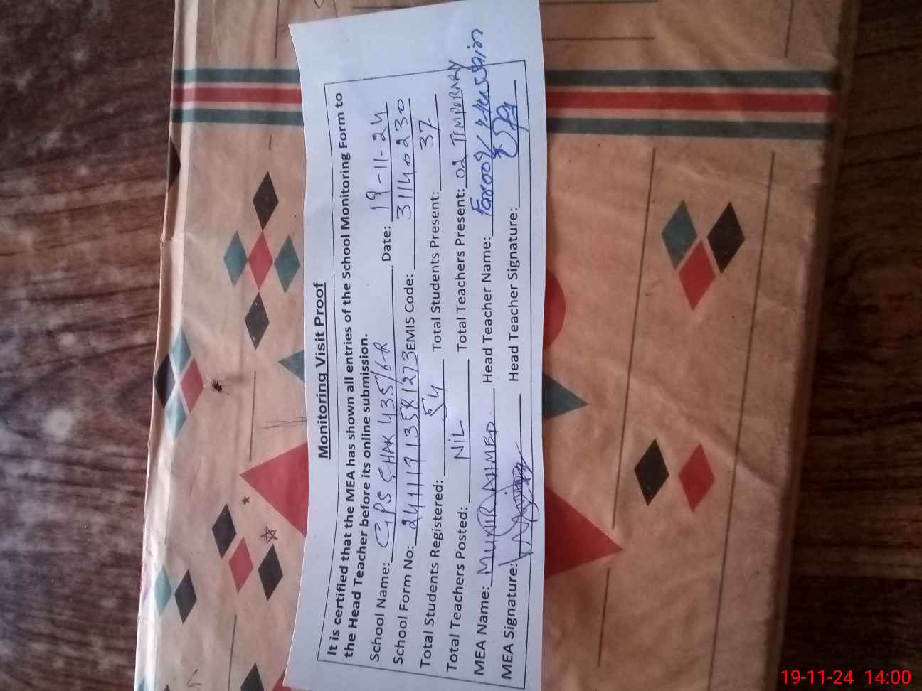 | Attendance Register | Head Teacher | MEA with School | Visit Proof |