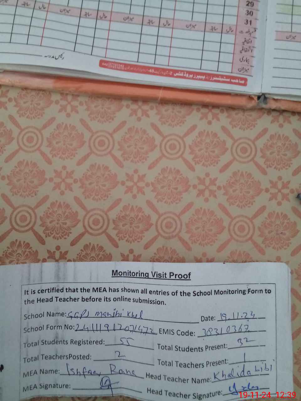 | Attendance Register | Head Teacher | MEA with School | Visit Proof |