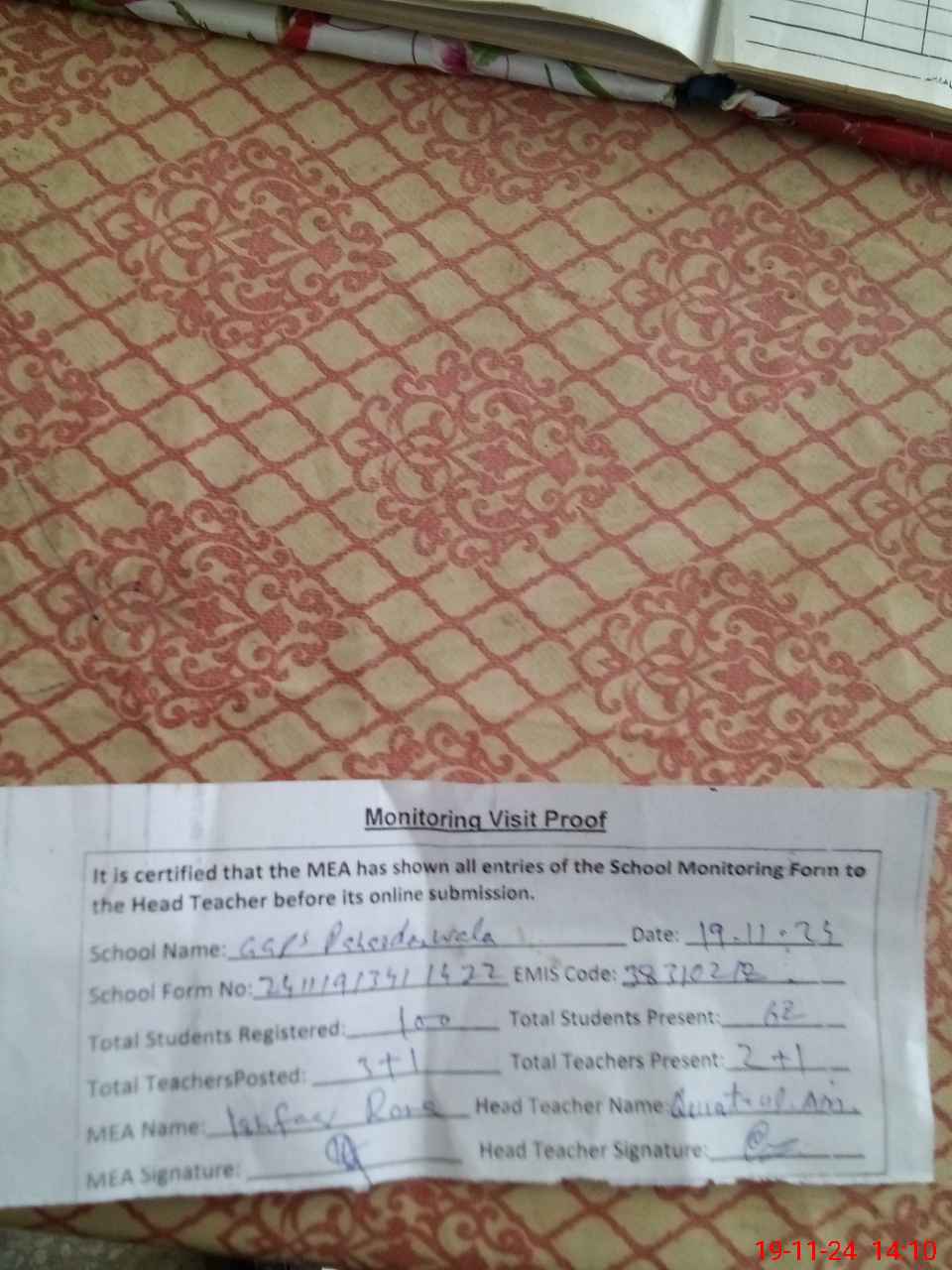 | Attendance Register | Head Teacher | MEA with School | Visit Proof |