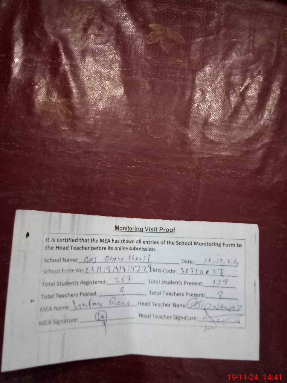 | Attendance Register | Head Teacher | MEA with School | Visit Proof |