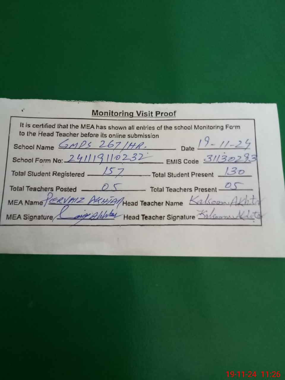 | EMIS Code: 31130293 | Name of School: GMPS CHAK NO 267 HR | |||