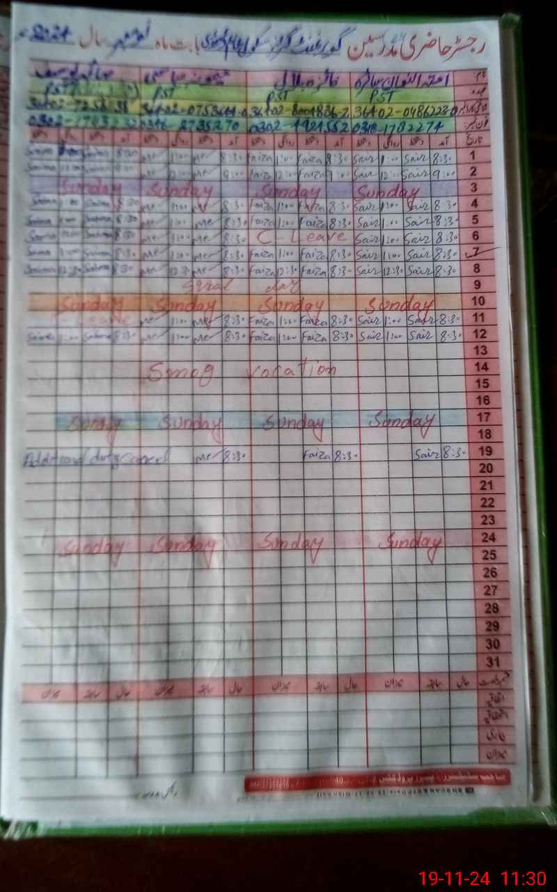 | CNIC | Full Name | Designation | R/C | Absence During Last Calender Month |