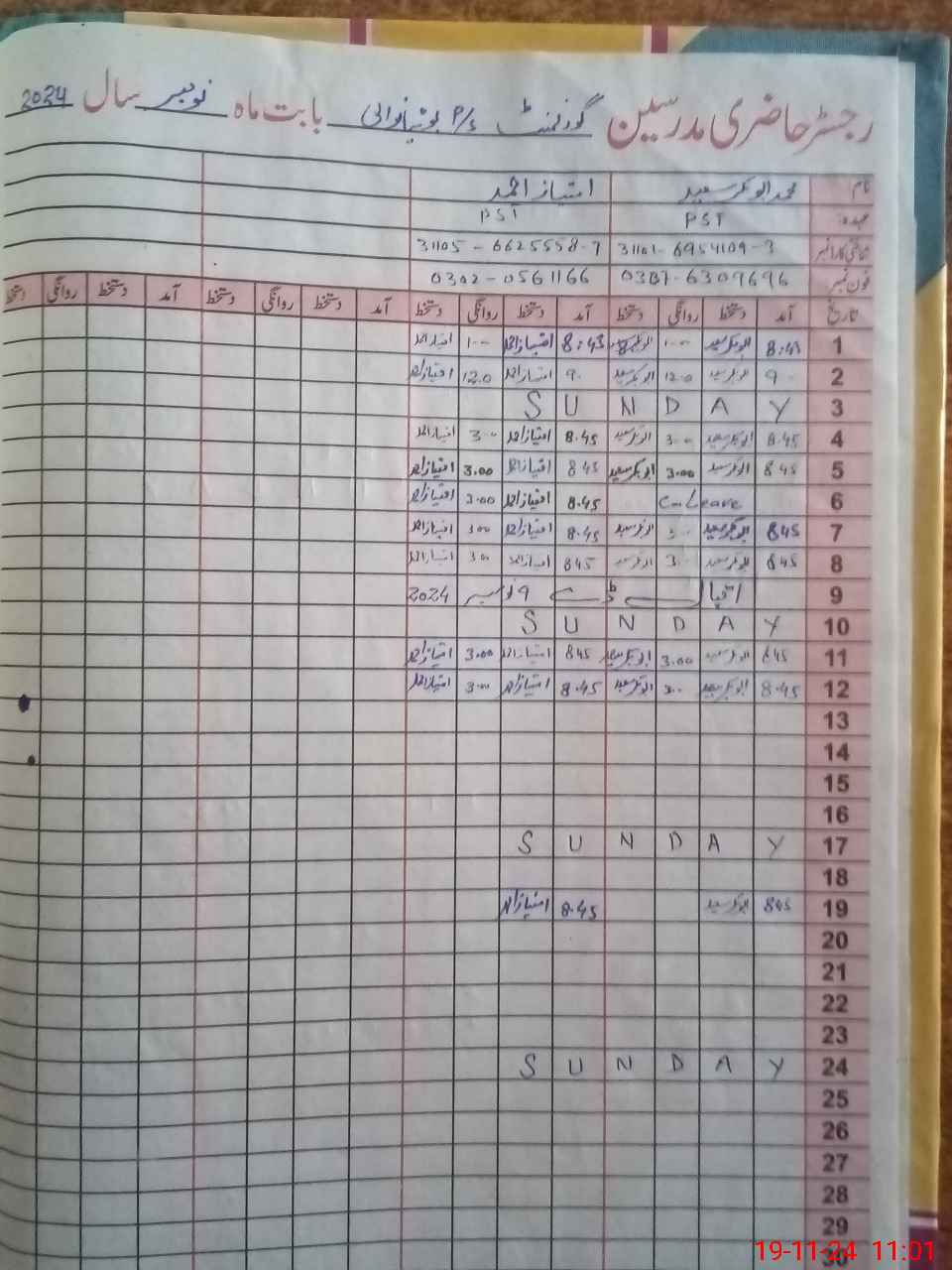 | CNIC | Full Name | Designation | R/C | Absence During Last Calender Month |