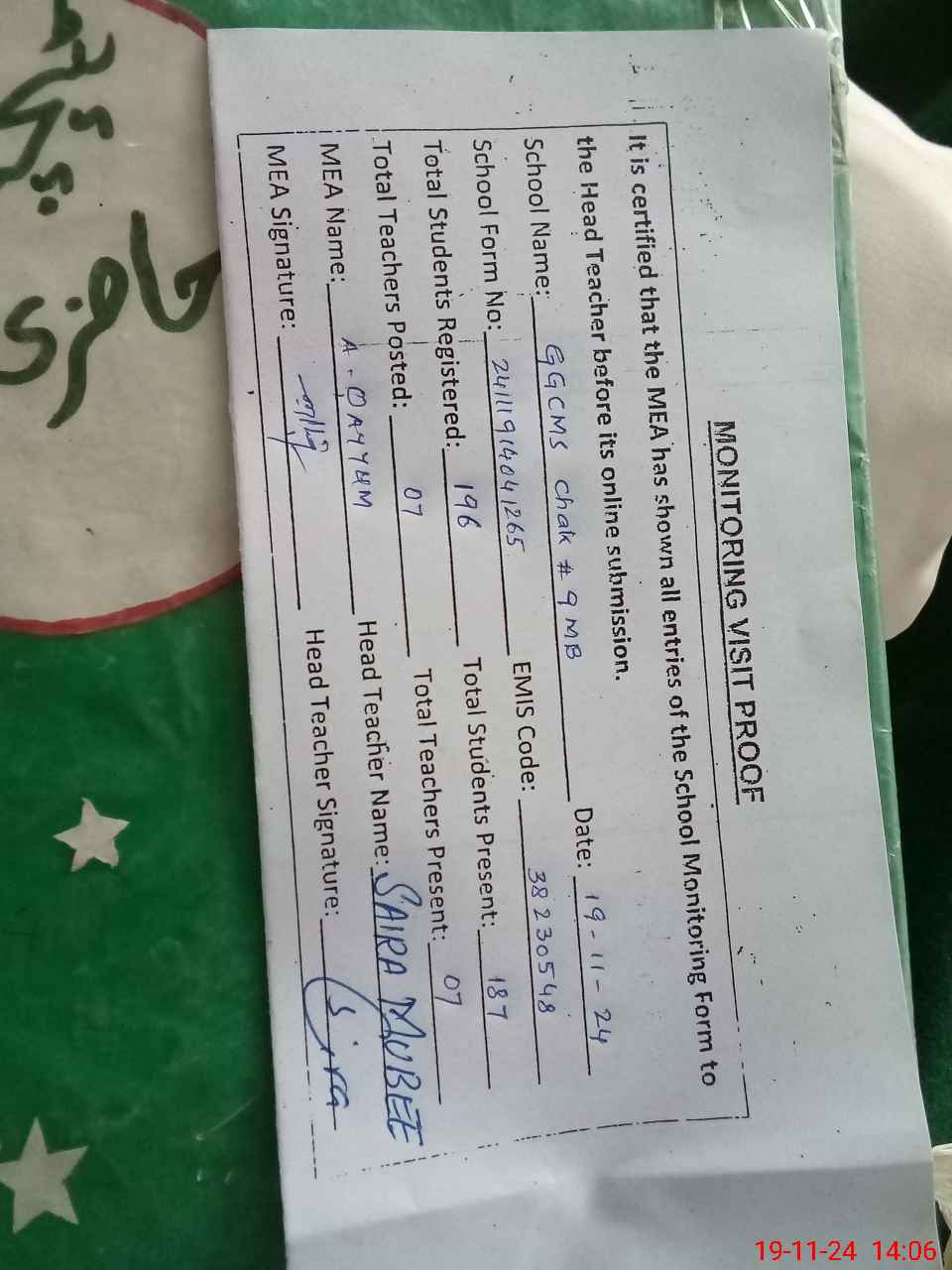 | Certified that this School was Inspected by the Undersigned MEA/DMO Today and the Information Stated Above is as Per Record. | |||||