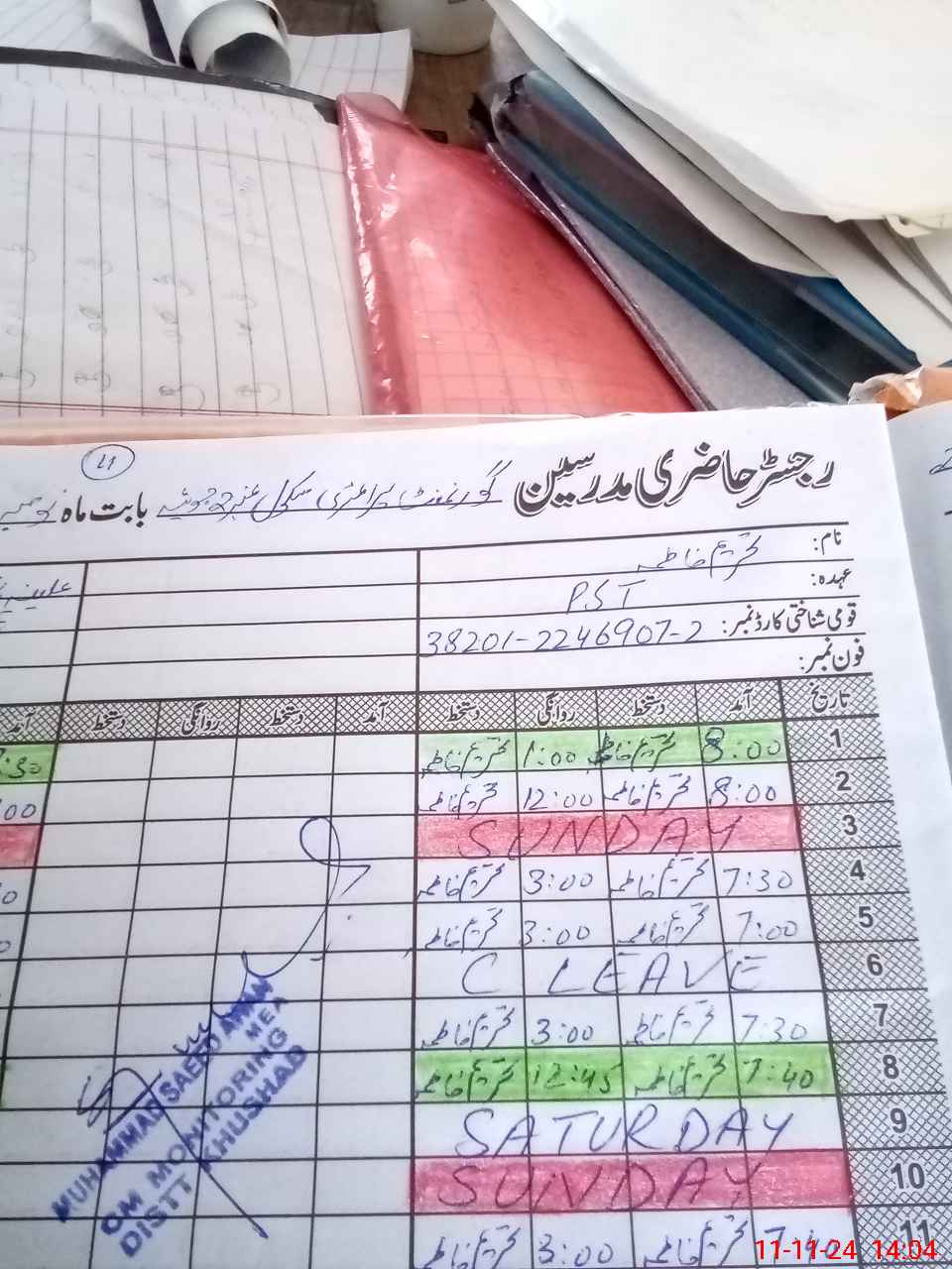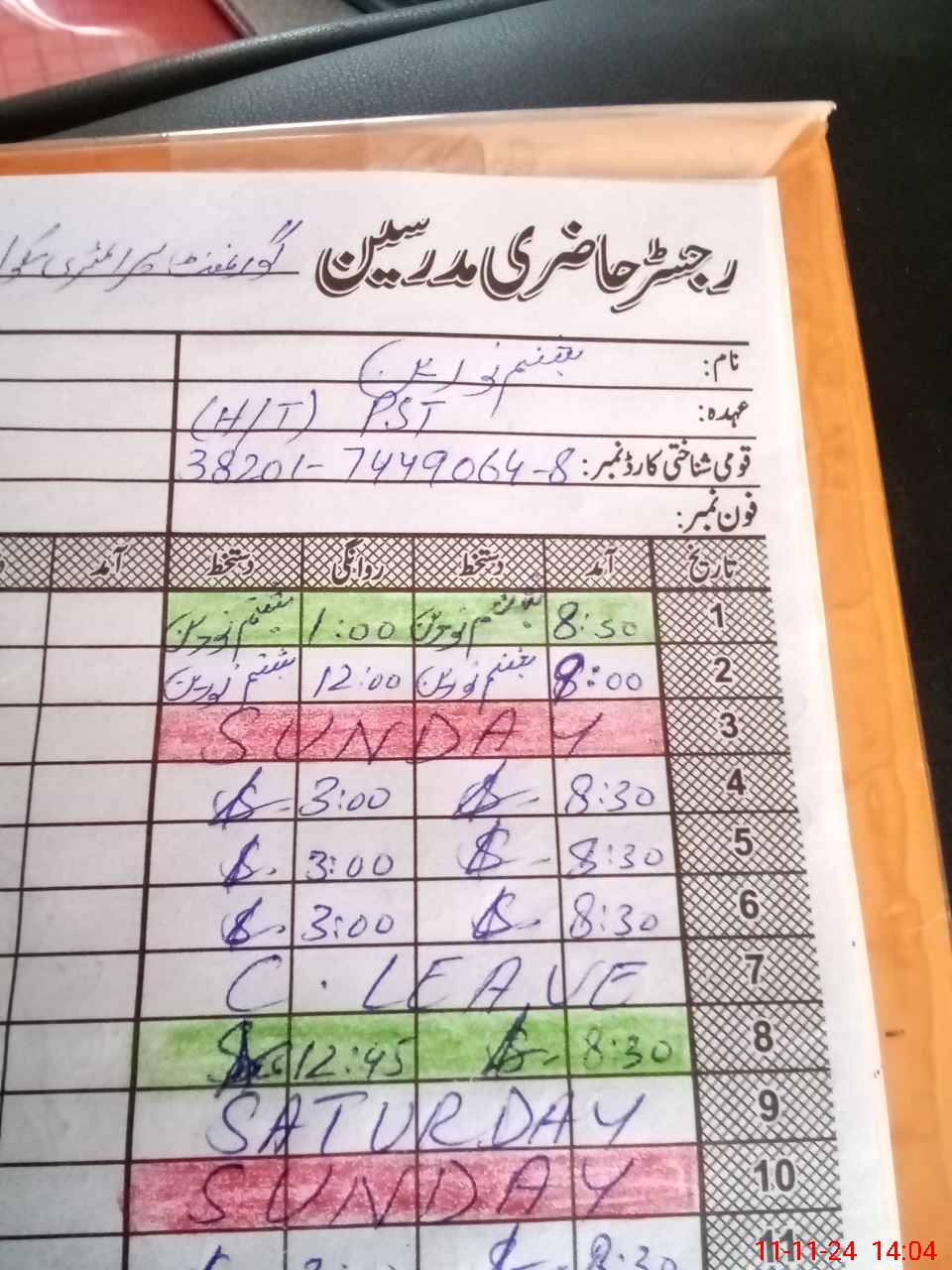| CNIC | Full Name | Designation | R/C | Absence During Last Calender Month |