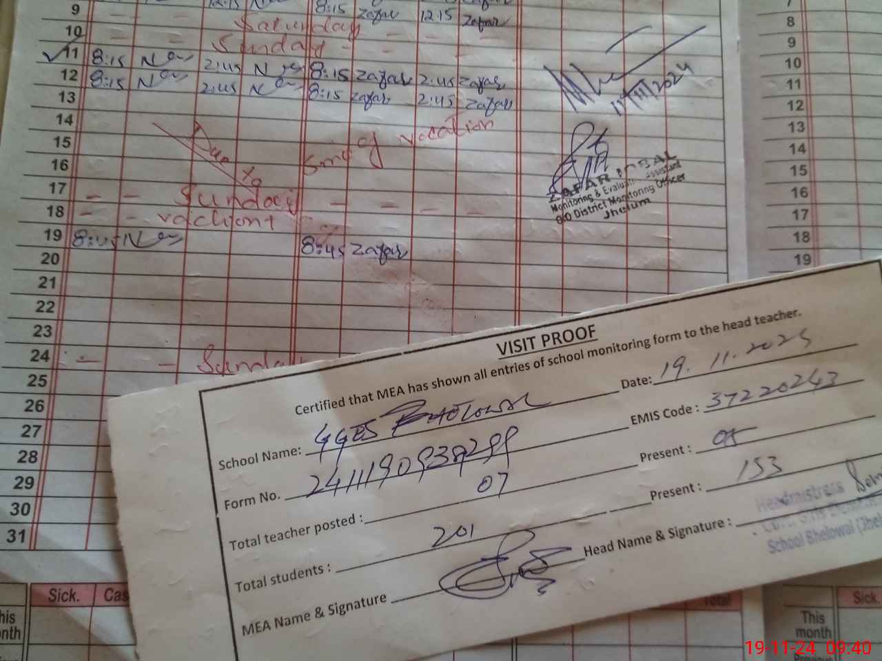 | Attendance Register | Head Teacher | MEA with School | Visit Proof |