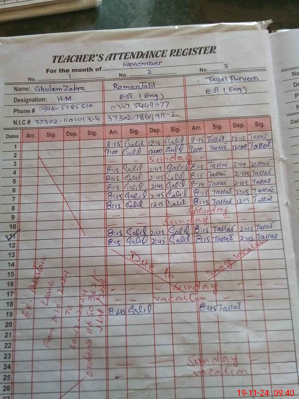 | CNIC | Full Name | Designation | R/C | Absence During Last Calender Month |