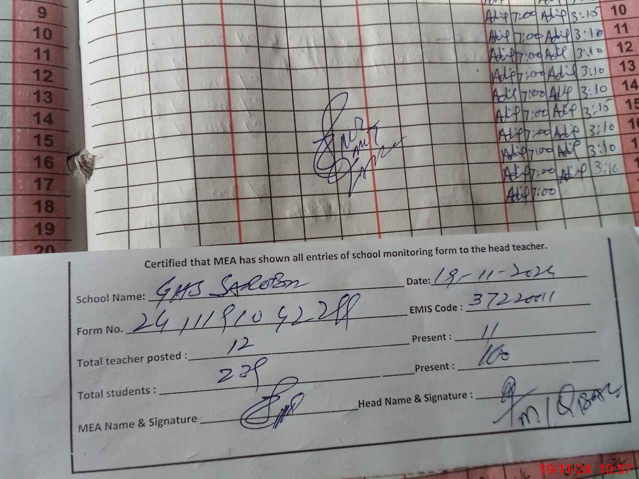 | Attendance Register | Head Teacher | MEA with School | Visit Proof |