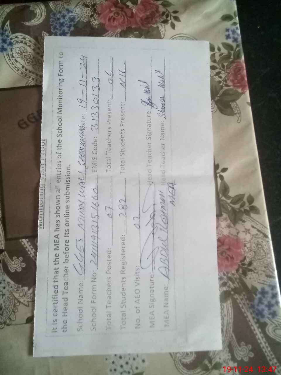 | Attendance Register | Head Teacher | MEA with School | Visit Proof |