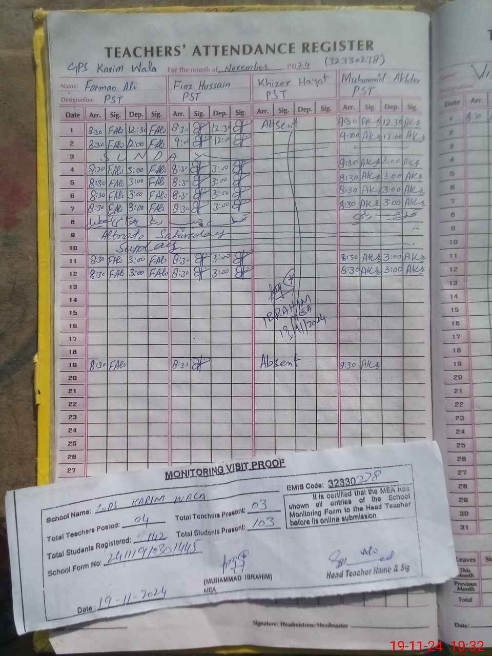 | Attendance Register | Head Teacher | MEA with School | Visit Proof |