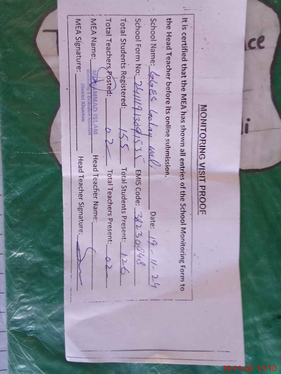 | Attendance Register | Head Teacher | MEA with School | Visit Proof |