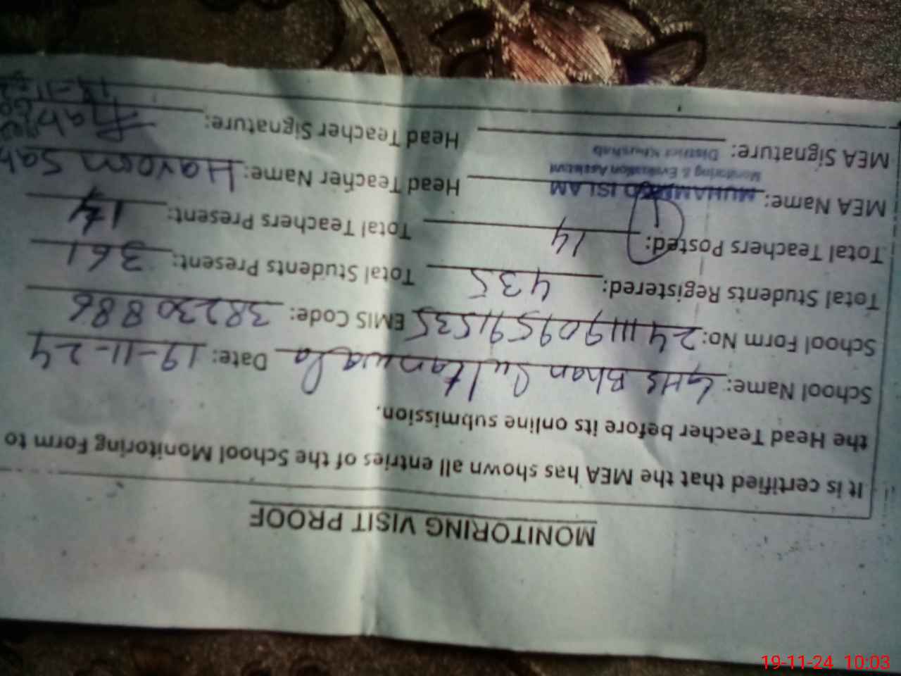 | Certified that this School was Inspected by the Undersigned MEA/DMO Today and the Information Stated Above is as Per Record. | |||||