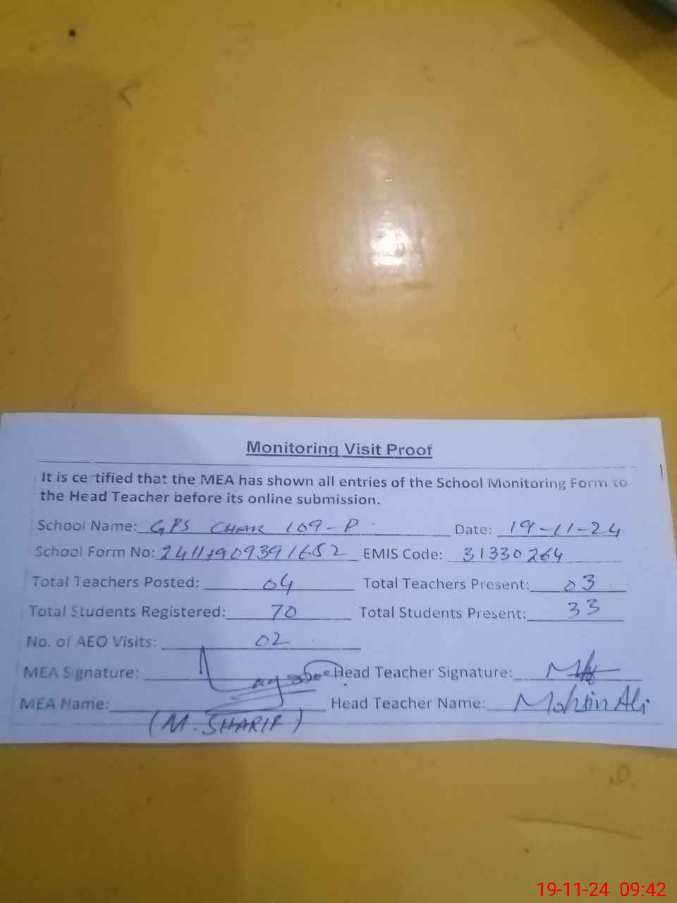 | EMIS Code: 31330264 | Name of School: GPS CHAK 109/P | |||