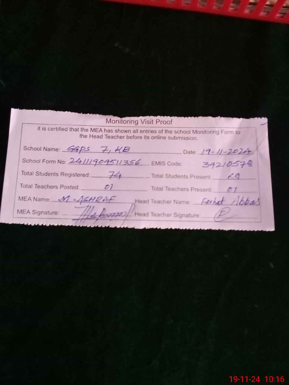| Attendance Register | Head Teacher | MEA with School | Visit Proof |