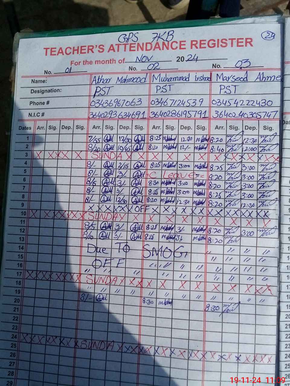 | CNIC | Full Name | Designation | R/C | Absence during last cal. month |