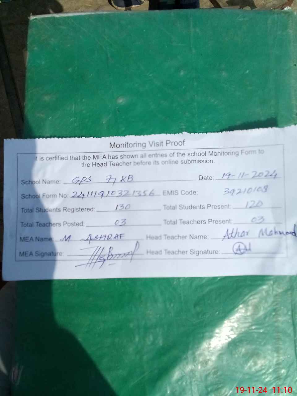 | Attendance Register | Head Teacher | MEA with School | Visit Proof |