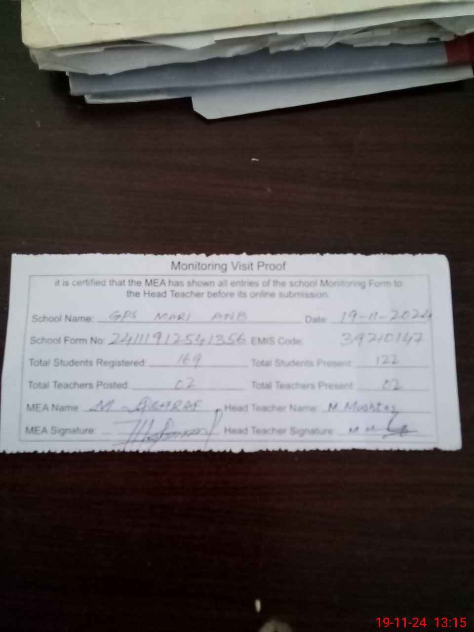 | Attendance Register | Head Teacher | MEA with School | Visit Proof |