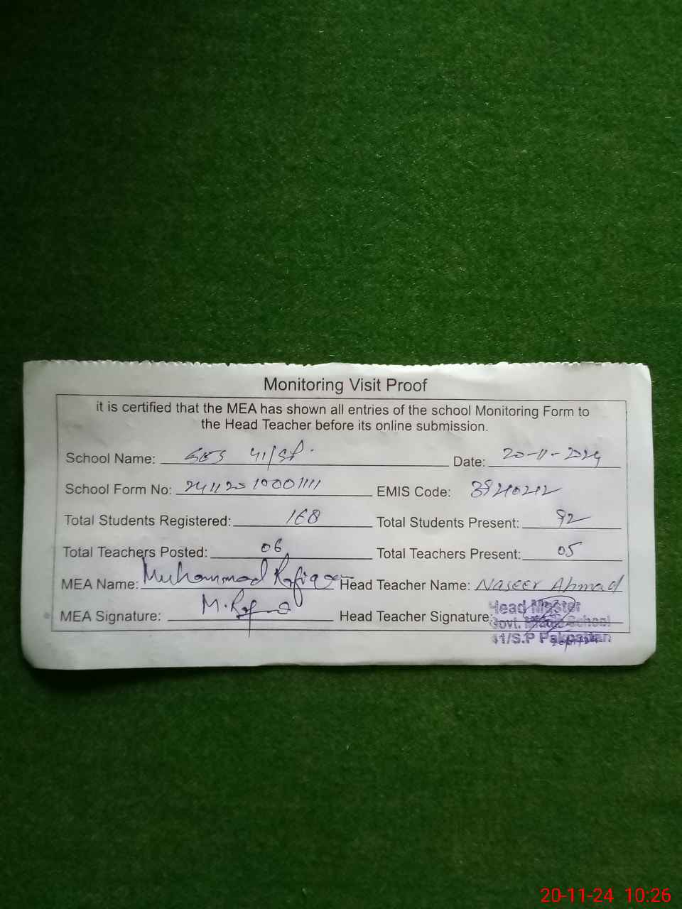 | Attendance Register | Head Teacher | MEA with School | Visit Proof |