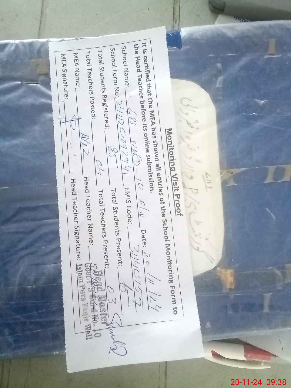 | Attendance Register | Head Teacher | MEA with School | Visit Proof |