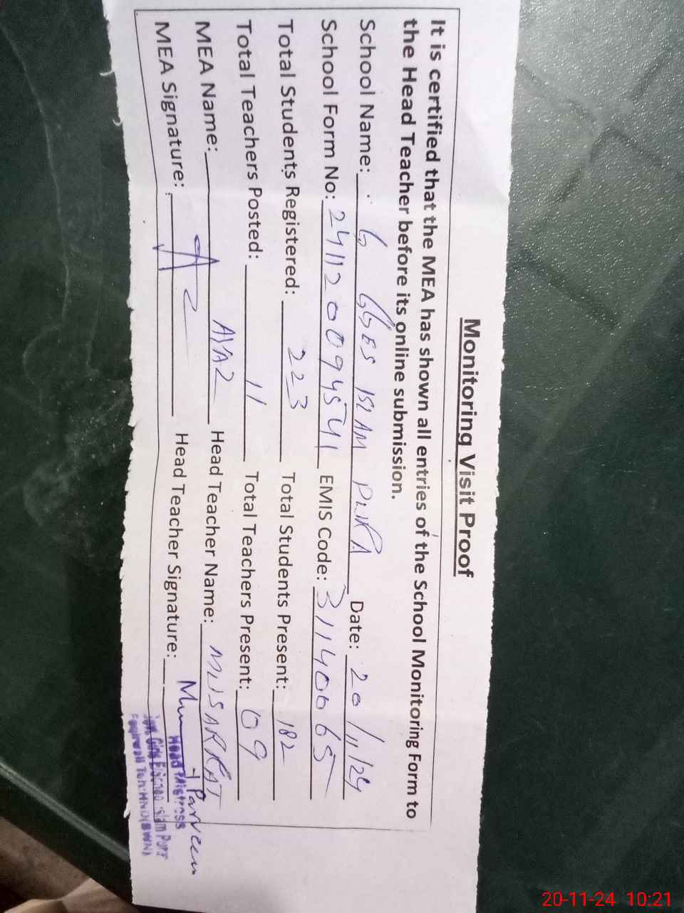 | Attendance Register | Head Teacher | MEA with School | Visit Proof |