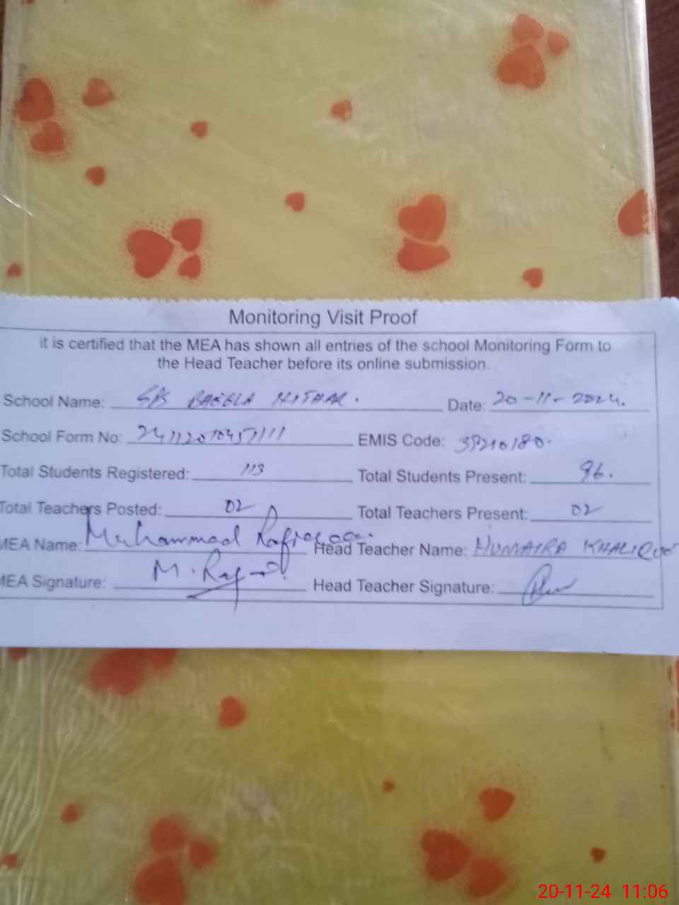 | Attendance Register | Head Teacher | MEA with School | Visit Proof |