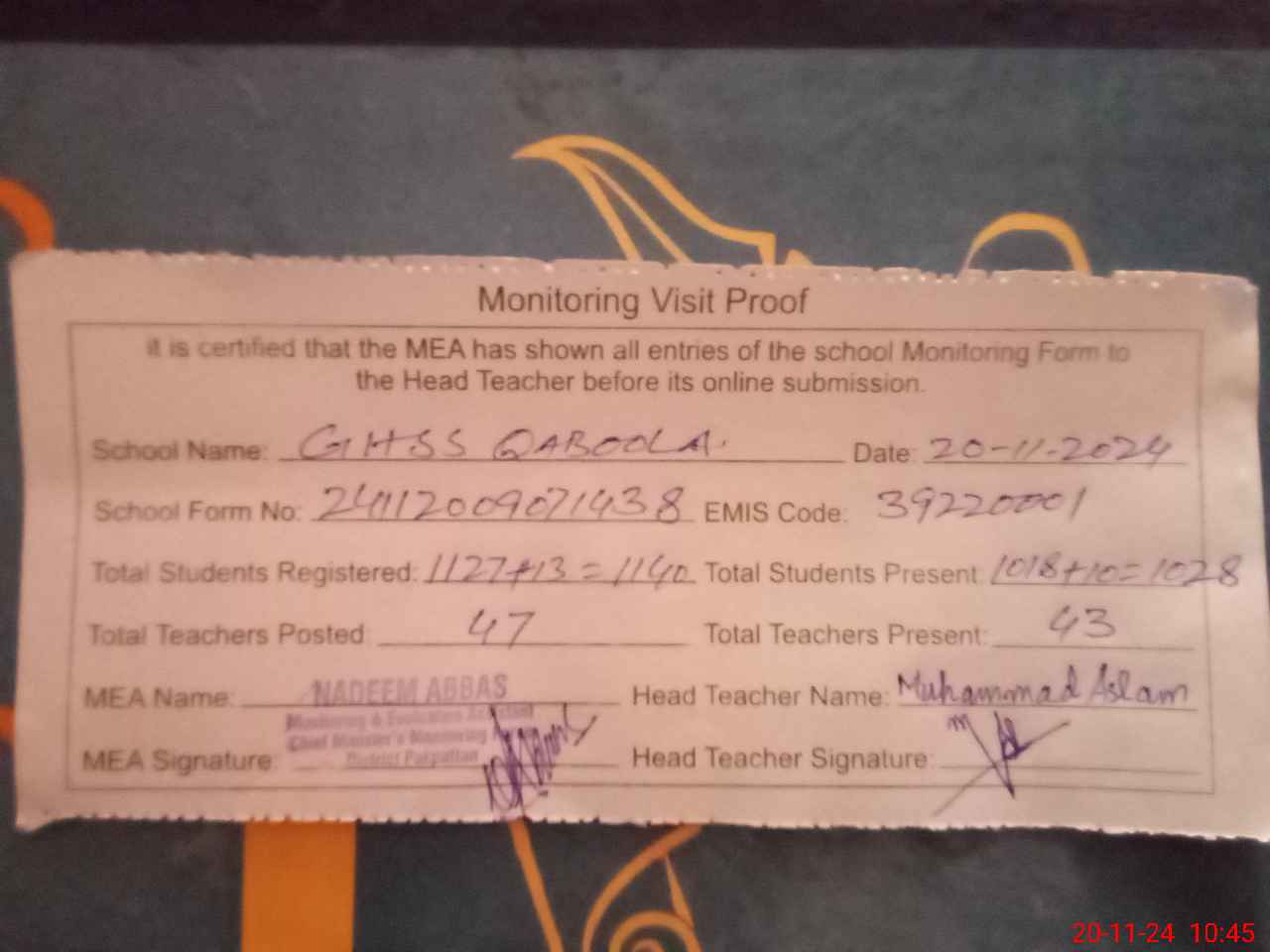 | Attendance Register | Head Teacher | MEA with School | Visit Proof |