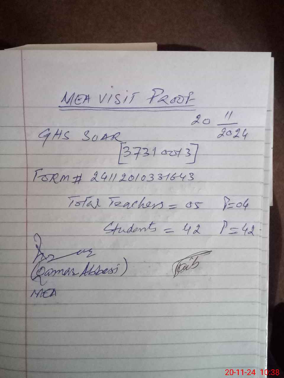 | Attendance Register | Head Teacher | MEA with School | Visit Proof |