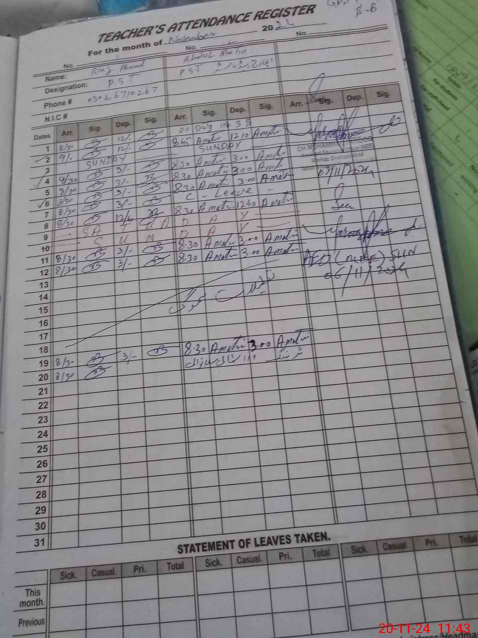 | CNIC | Full Name | Designation | R/C | Absence During Last Calender Month |