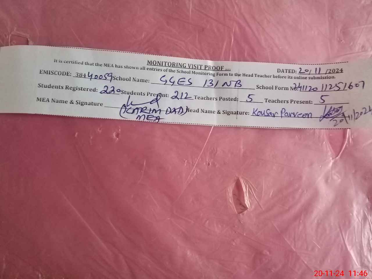 | Attendance Register | Head Teacher | MEA with School | Visit Proof |