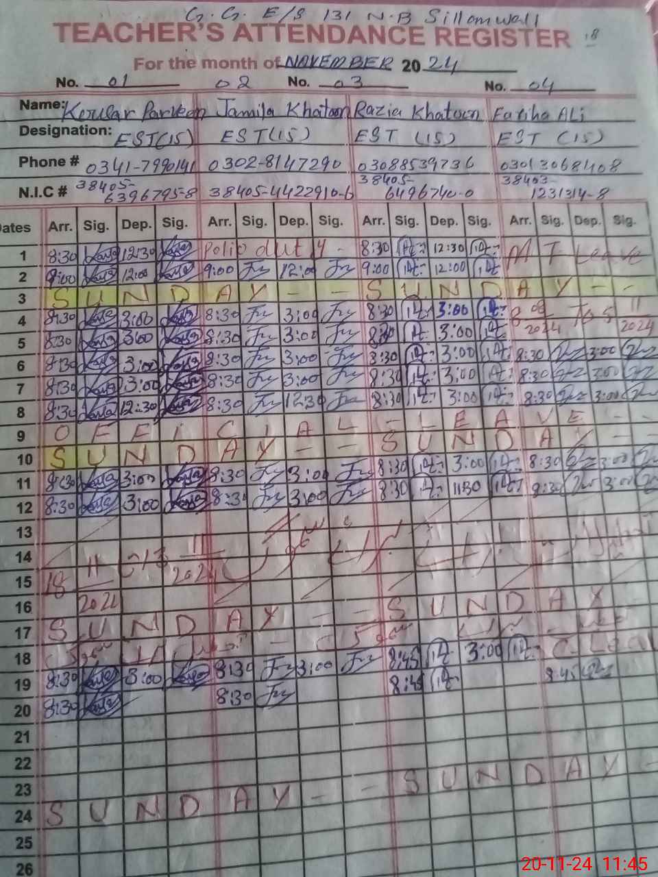 | CNIC | Full Name | Designation | R/C | Absence during last cal. month |