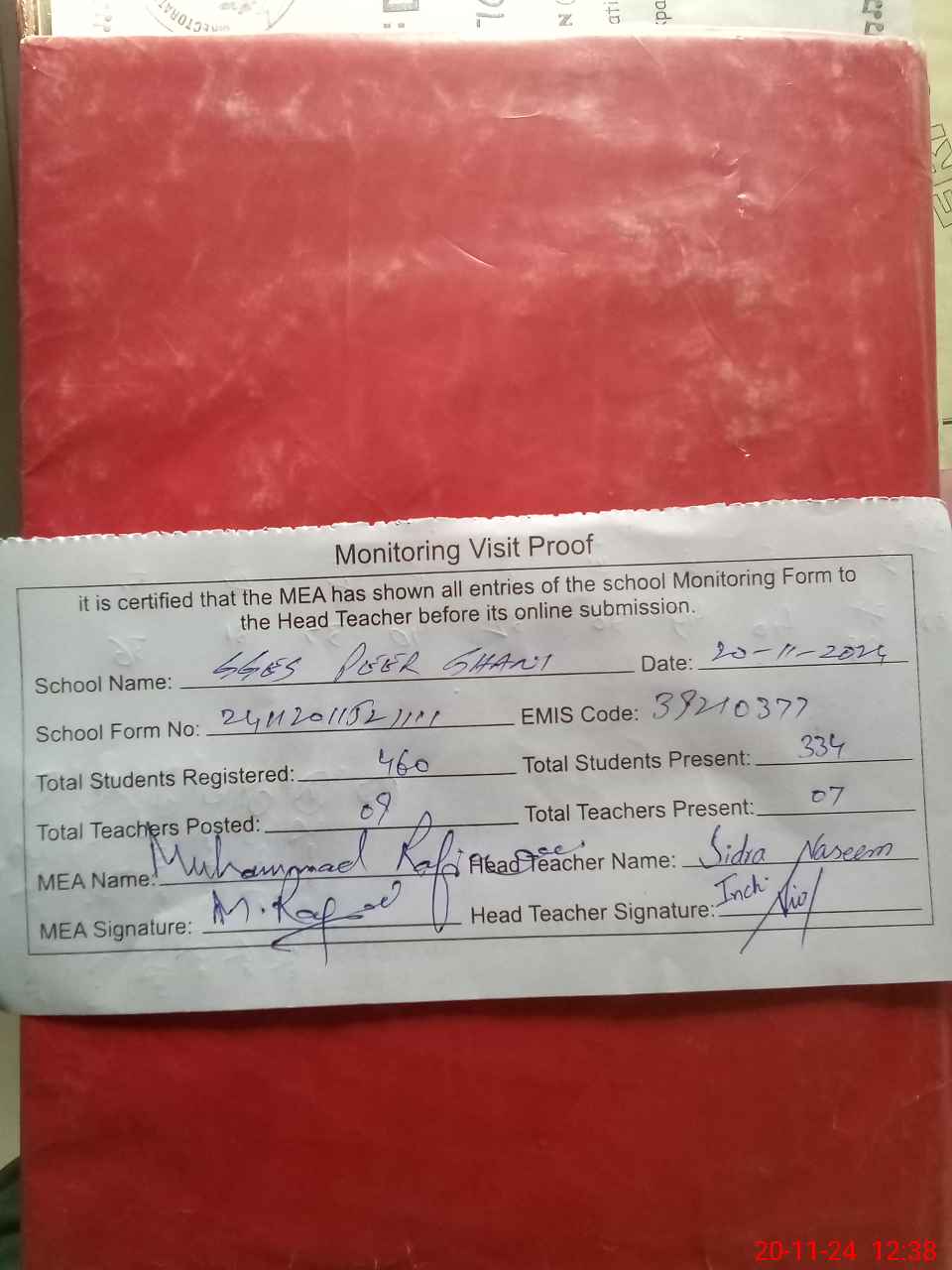| Attendance Register | Head Teacher | MEA with School | Visit Proof |