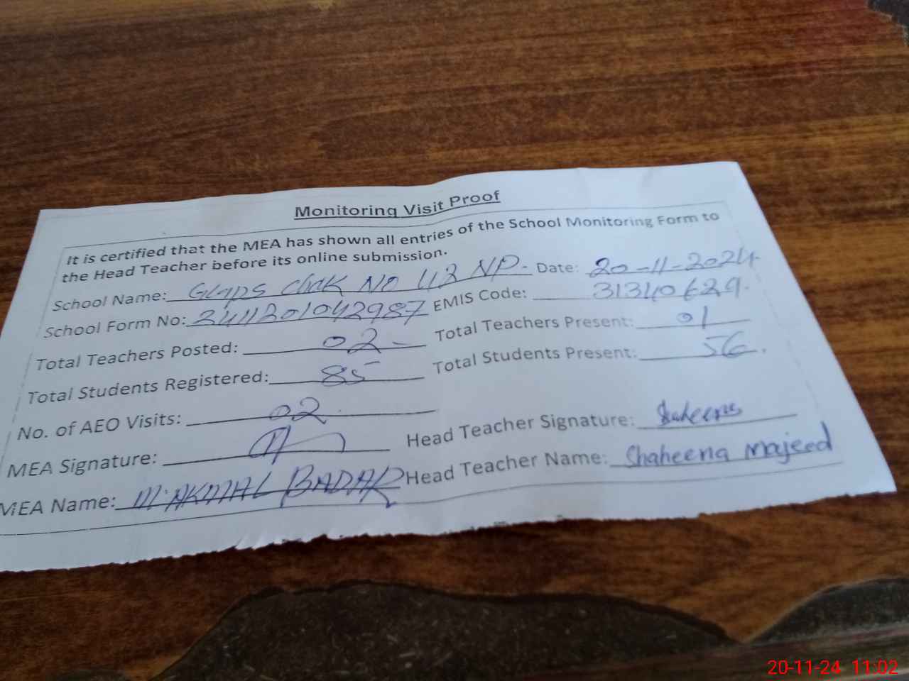 | Attendance Register | Head Teacher | MEA with School | Visit Proof |