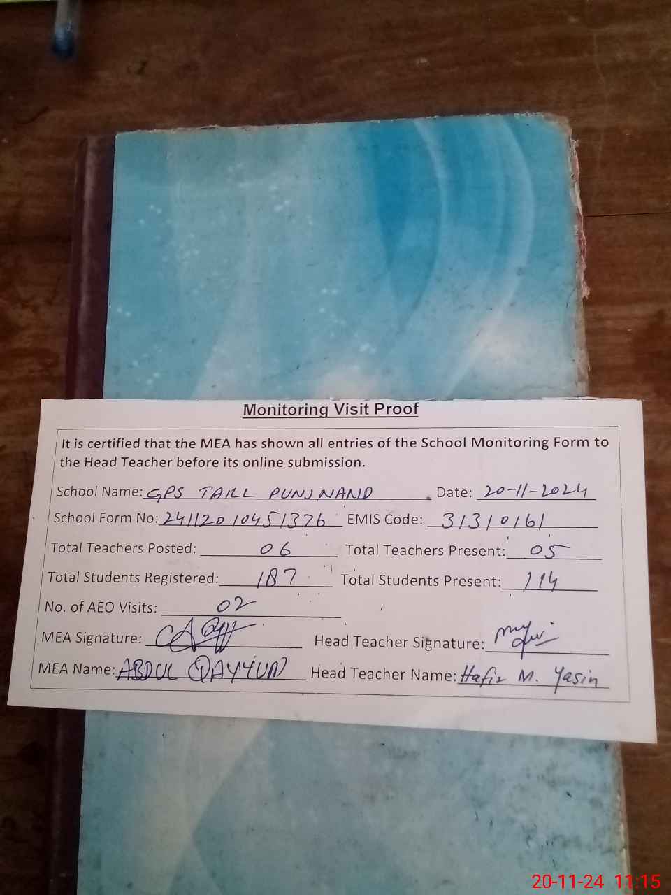 | Attendance Register | Head Teacher | MEA with School | Visit Proof |
