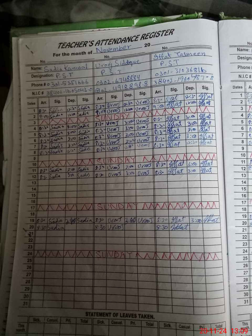 | CNIC | Full Name | Designation | R/C | Absence During Last Calender Month |