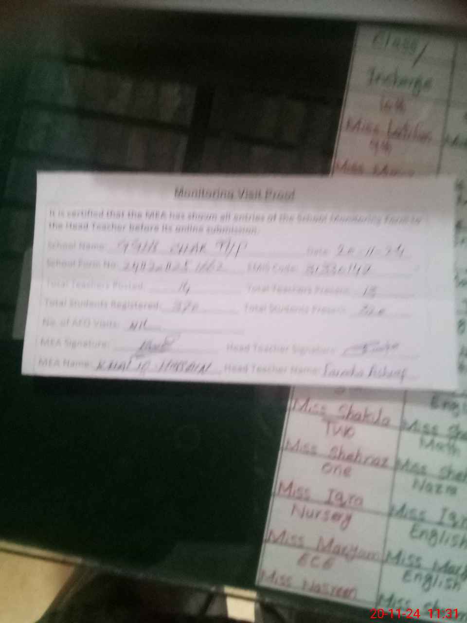 | Attendance Register | Head Teacher | MEA with School | Visit Proof |