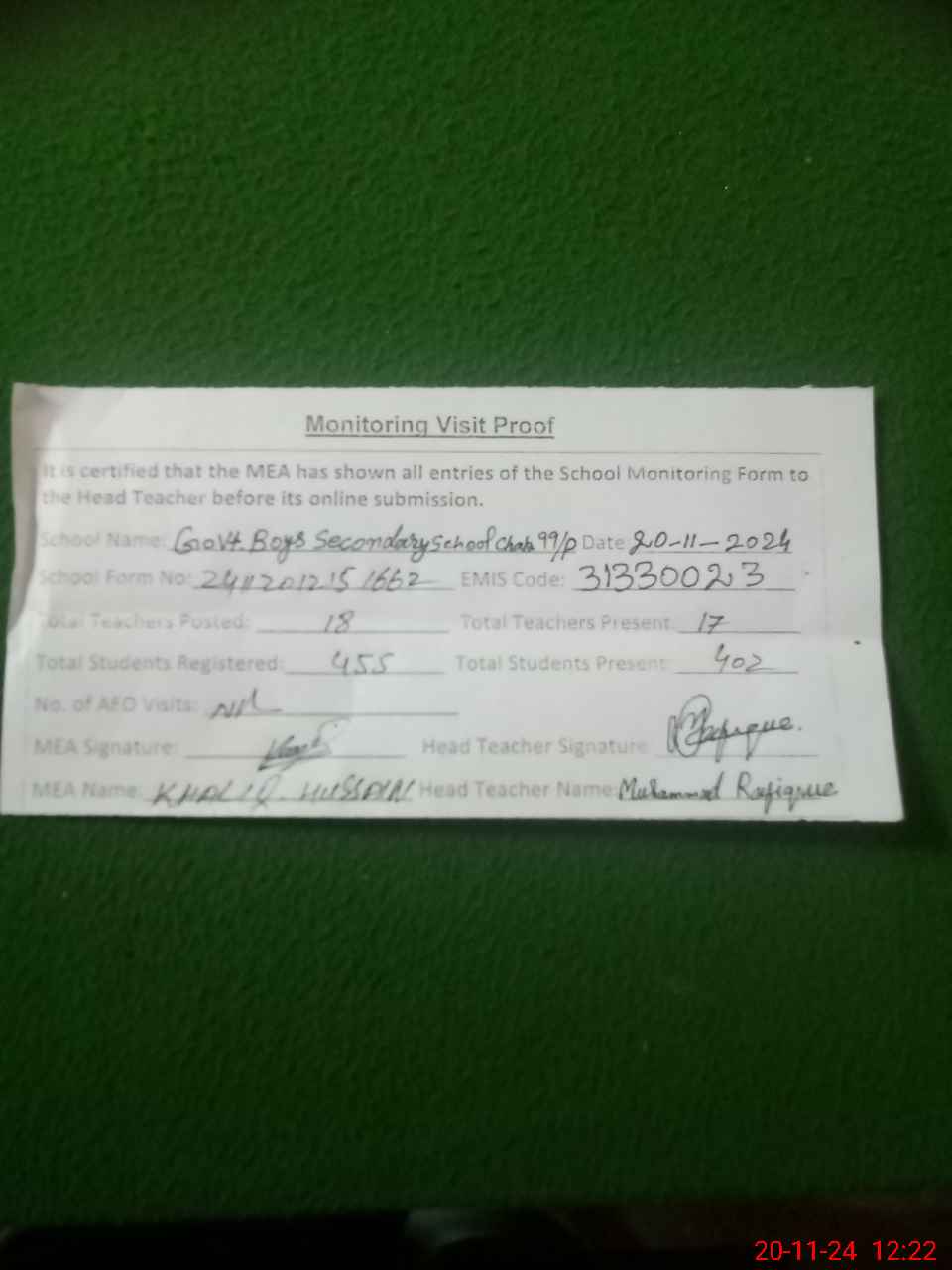 | EMIS Code: 31330023 | Name of School: GHS CHAK NO. 99/P | |||