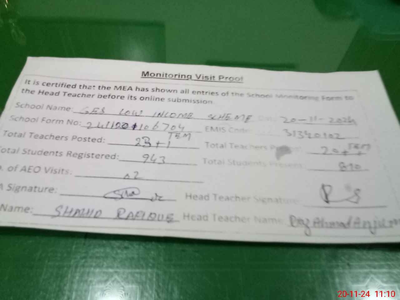 | Attendance Register | Head Teacher | MEA with School | Visit Proof |