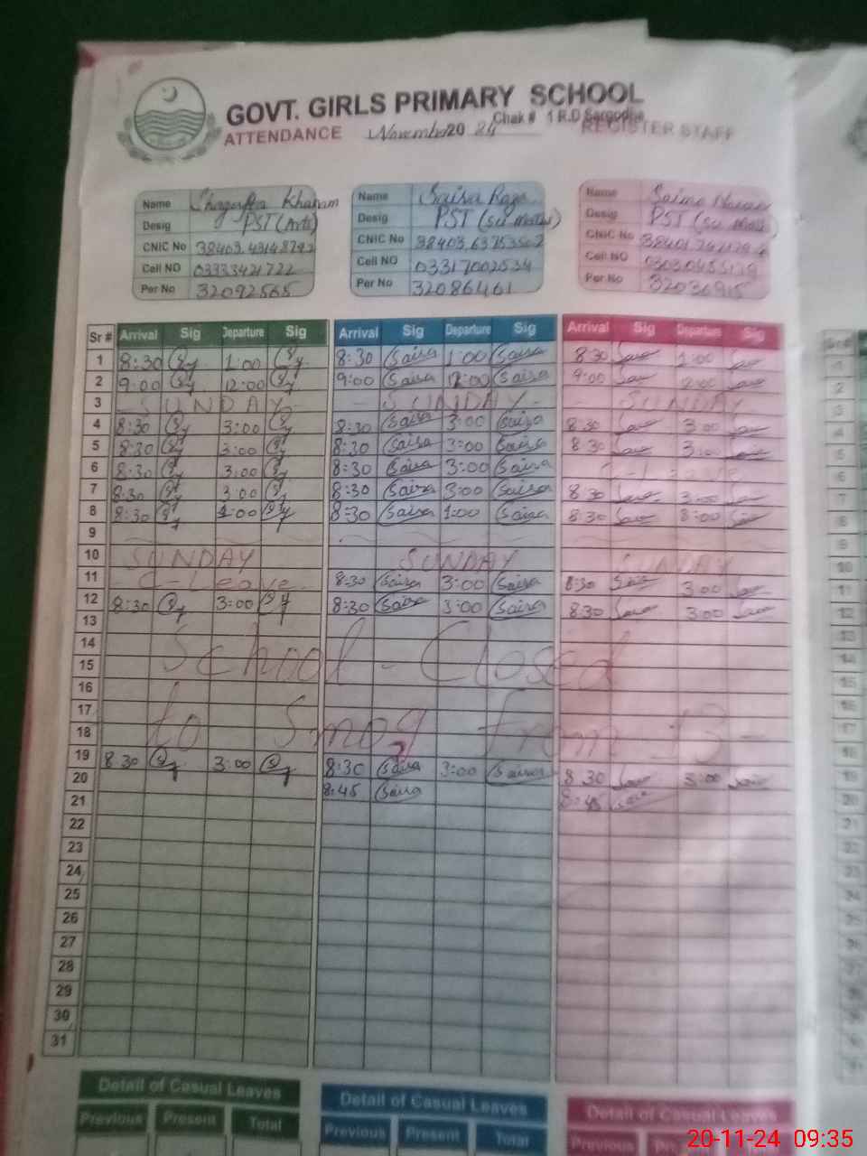 | CNIC | Full Name | Designation | R/C | Absence During Last Calender Month |