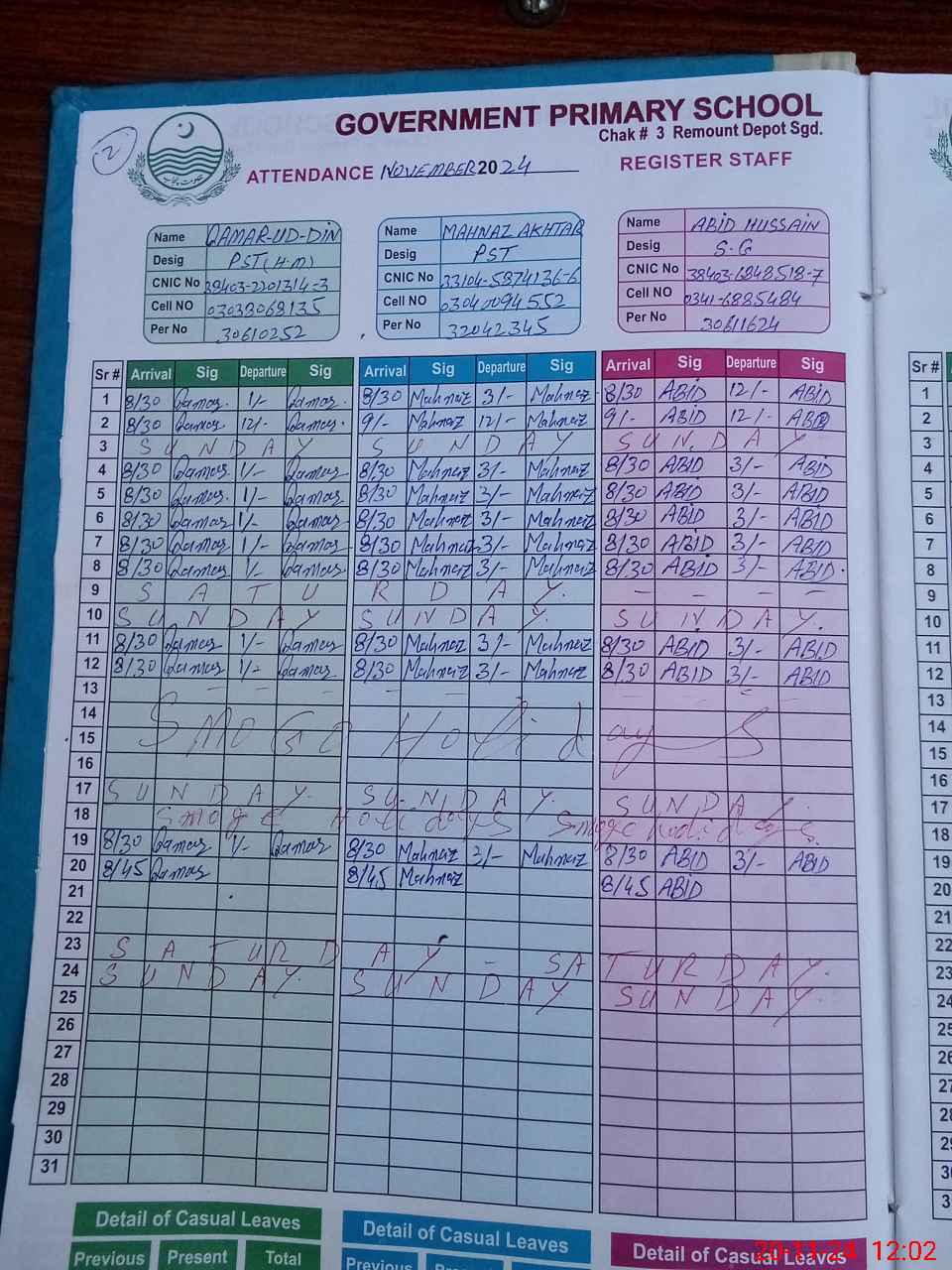 | CNIC | Full Name | Designation | R/C | Absence During Last Calender Month |