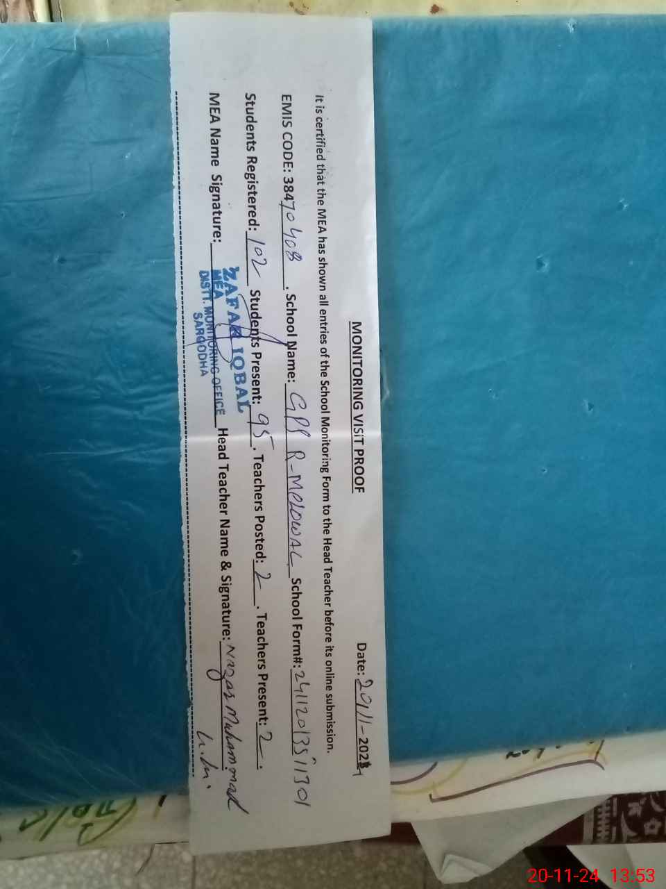 | Attendance Register | Head Teacher | MEA with School | Visit Proof |