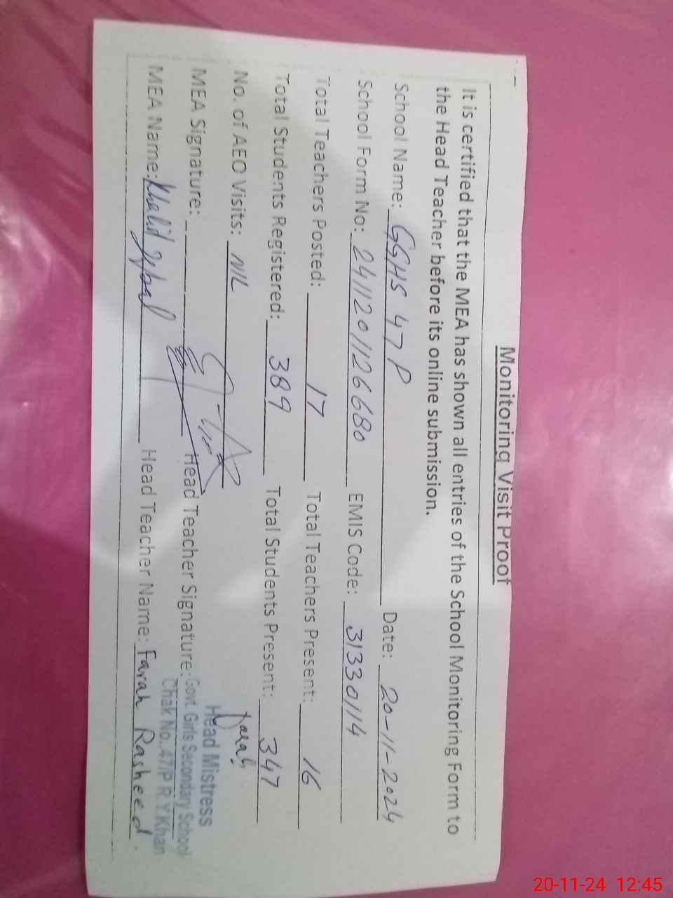 | EMIS Code: 31330114 | Name of School: GGHS 47/P | |||