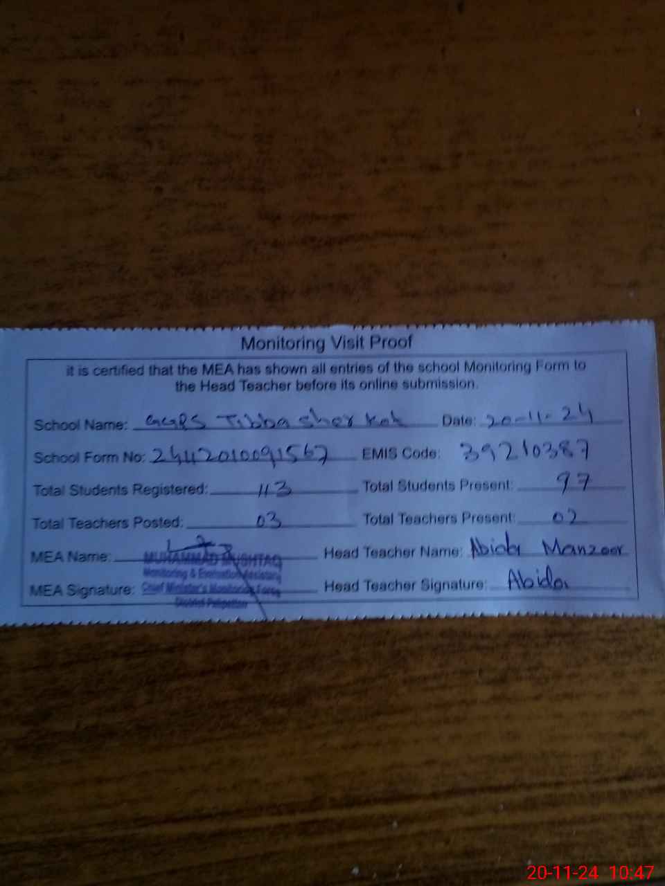 | Attendance Register | Head Teacher | MEA with School | Visit Proof |