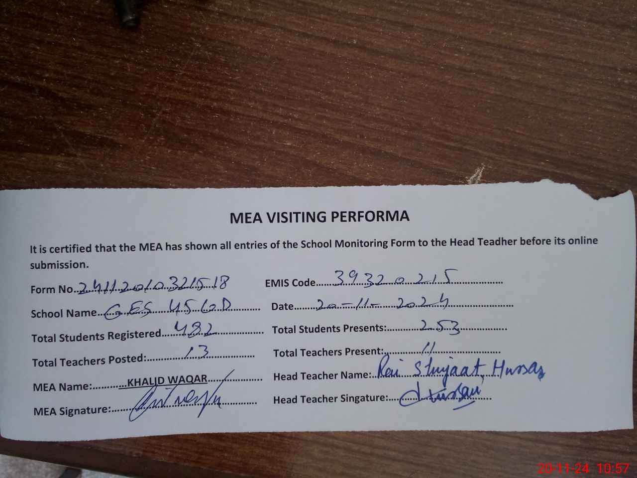 | Attendance Register | Head Teacher | MEA with School | Visit Proof |