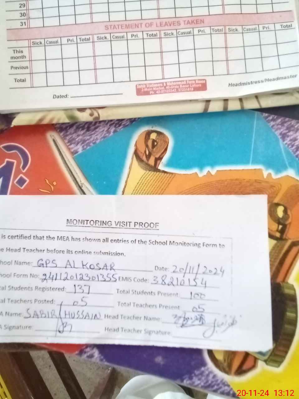 | Attendance Register | Head Teacher | MEA with School | Visit Proof |
