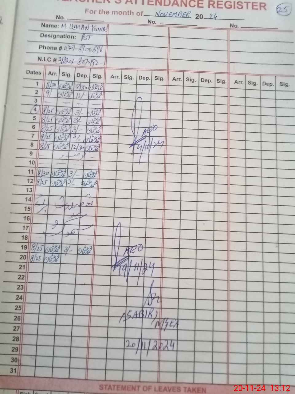 | CNIC | Full Name | Designation | R/C | Absence During Last Calender Month |