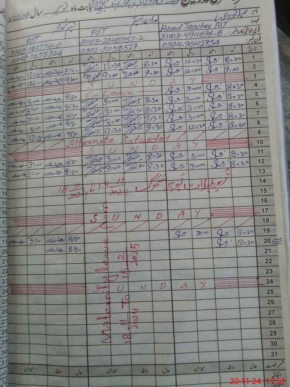 | CNIC | Full Name | Designation | R/C | Absence During Last Calender Month |
