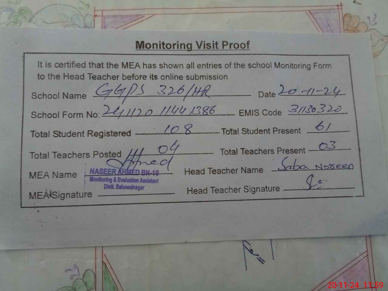 | Attendance Register | Head Teacher | MEA with School | Visit Proof |