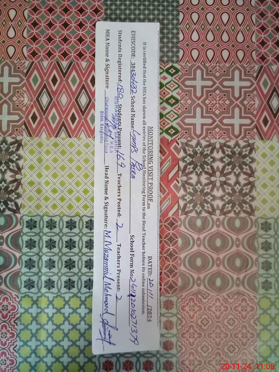 | Certified that this School was Inspected by the Undersigned MEA/DMO Today and the Information Stated Above is as Per Record. | |||||